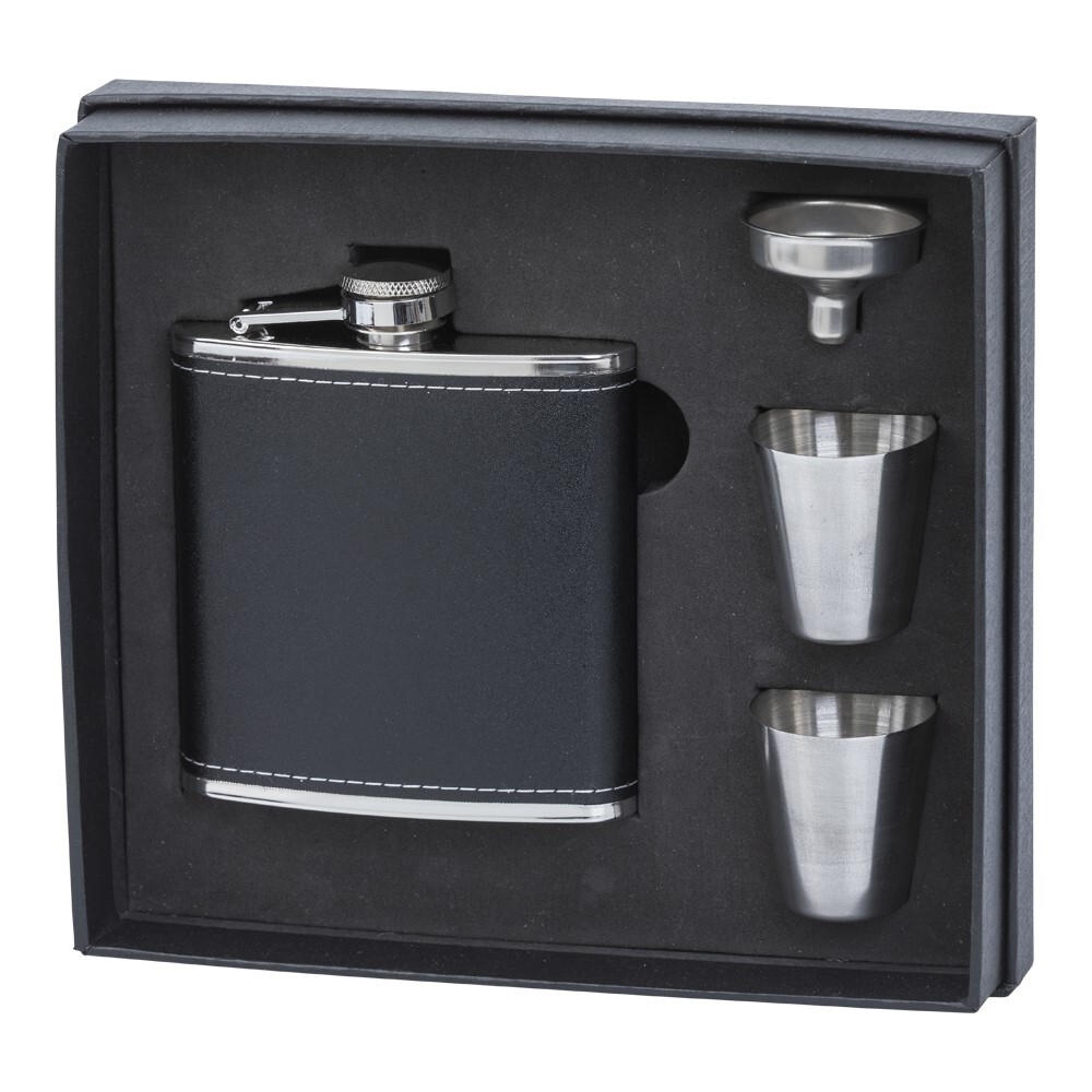 Nahkainen taskumattisetti on tilavuudeltaan 180 ml. Pakkaus sisältää taskumatin, kaksi pientä lasia ja tratin. Setti on valmistettu ruostumattomasta teräksestä ja keinonahasta.