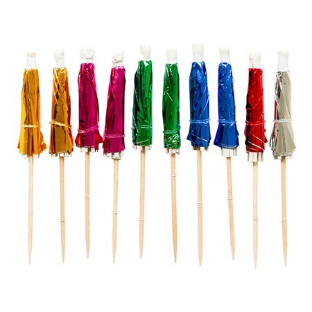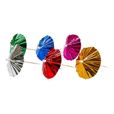 Paketissa 10kpl värikkäitä, metallinhohtoisia drinkkivarjoja.