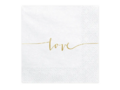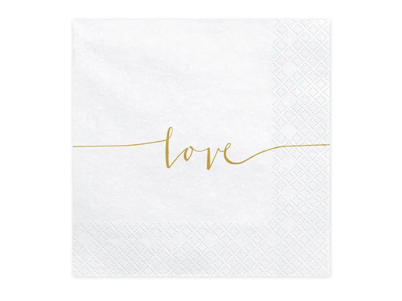 Valkoinen lautasliina kultaisella love tekstillä. Yksikertainen mutta kaunis servetti esimerkiksi häihin ja kihlajaisiin.